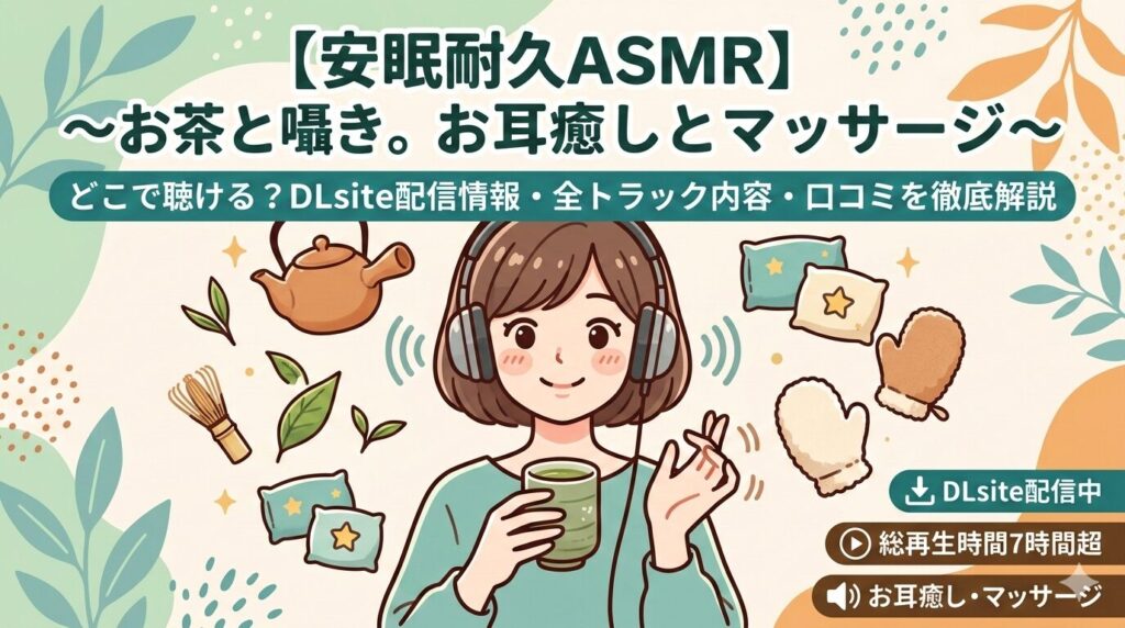 【安眠耐久ASMR】~お茶と囁き。お耳癒しとマッサージ~はどこで聴ける?DLsite配信情報・全トラック内容・口コミを徹底解説 「今夜こそぐっすり眠りたい」「茶道の静かな音に包まれて癒されたい」――そんな方におすすめの安眠特化型ASMR作品が、サークル「...