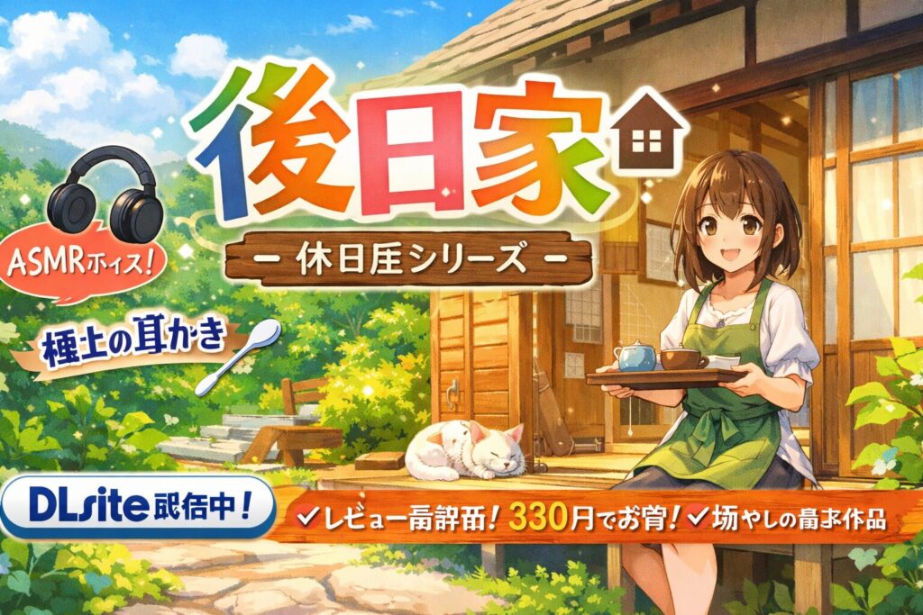 「後日家」はどこで聴ける?DLsite配信情報・口コミ・魅力を徹底解説【とみみ庵・休日屋シリーズ】 「後日家」はサークル「とみみ庵」が制作した全年齢向け音声作品で、人気シリーズ「休日屋」の後日談です。DLsiteにて330円で配信中。バイノーラル収録に... -