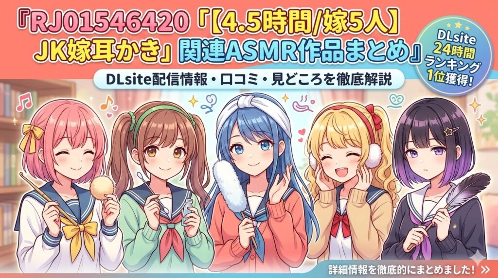 RJ01546420「【4.5時間/嫁5人】JK嫁耳かき」関連ASMR作品まとめ|DLsite配信情報・口コミ・見どころを徹底解説 「RJ01546420」は、サークル「ゆうとぴゅあ」が手がけた全年齢向け癒し系耳かきASMR作品「【4.5時間/嫁5人】JK嫁耳かき」の品番です。5人のヒ... -