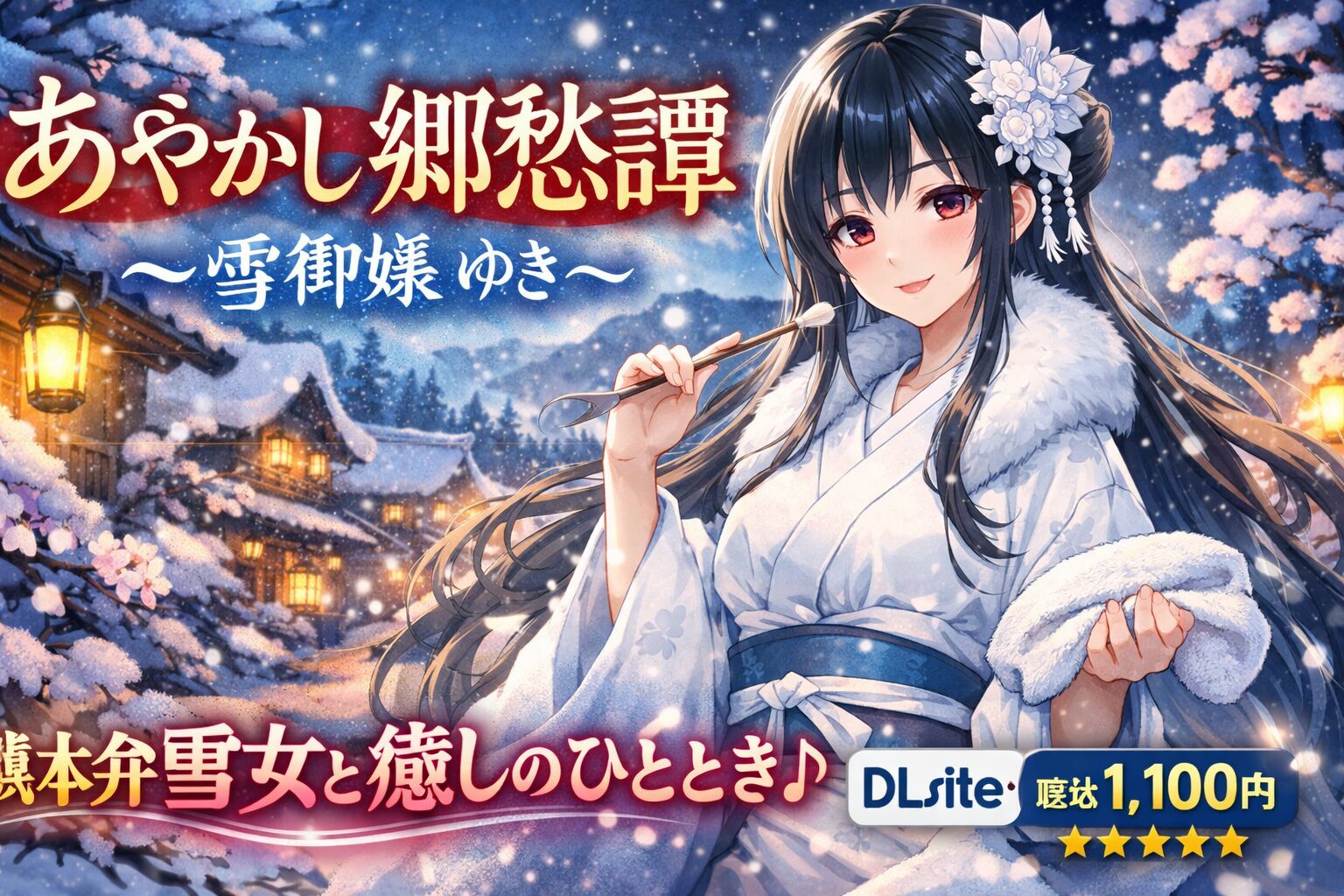 「あやかし郷愁譚 ~雪御嬢 ゆき~」は、熊本弁の雪女が耳かき・乾布摩擦・安眠導入で約2時間半にわたり癒してくれるバイノーラル音声作品です。DLsiteで配信中で、通常価格1,100円。レビュー68件・評価4.82と非常に高い満足度を誇る人気タイトルです。