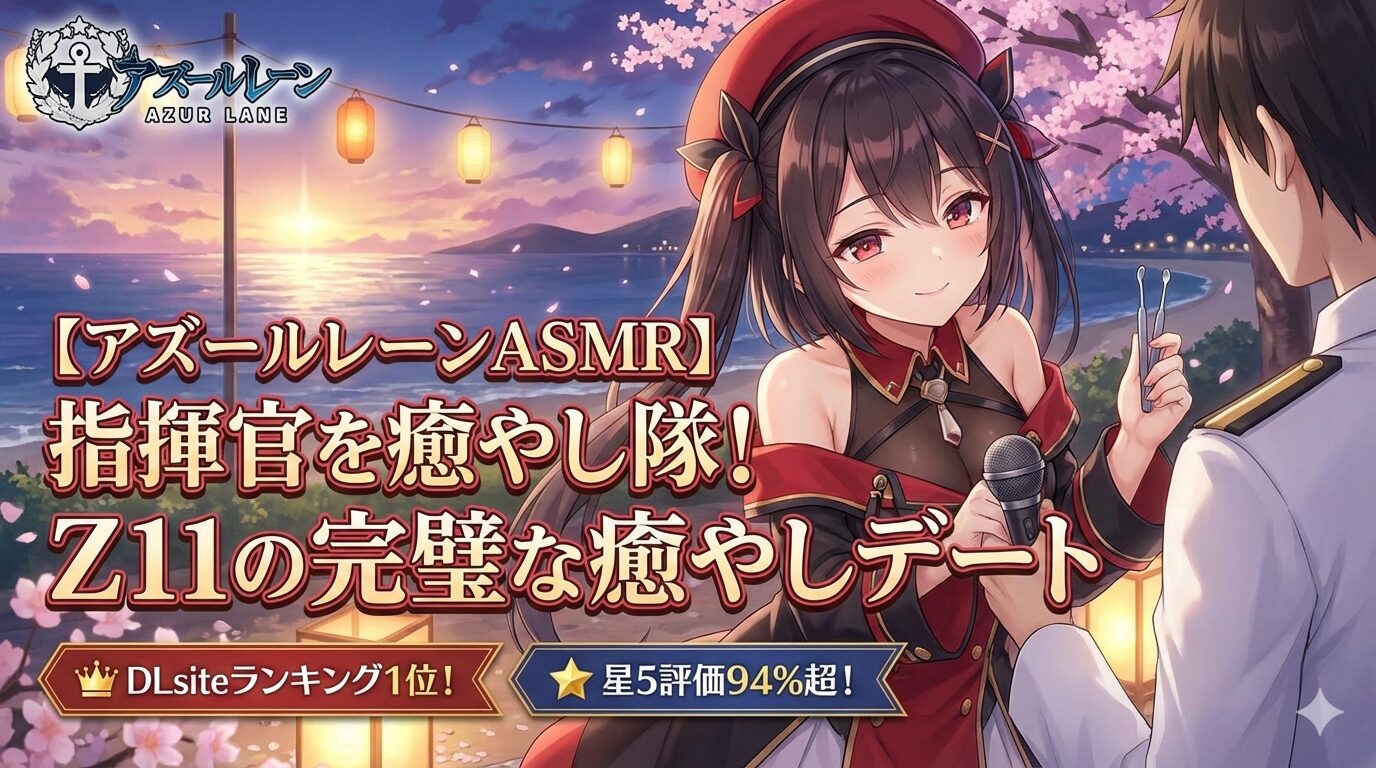 アズールレーンASMRシリーズ第23弾「指揮官を癒やし隊!Z11の完璧な癒やしデート」は、DLsiteの月間・週間・デイリーランキングすべてで1位を獲得し、星5評価が全体の94%を超える驚異的な高評価作品です。声優・寺澤百花さんが演じるZ11の七変化ボイスによる”完璧な癒やしデート”は、原作ゲーム未プレイのリスナーまで虜にするほどの完成度を誇ります。この記事では、本作の詳細な内容や口コミ・評判、購入方法までを徹底的に解説します。