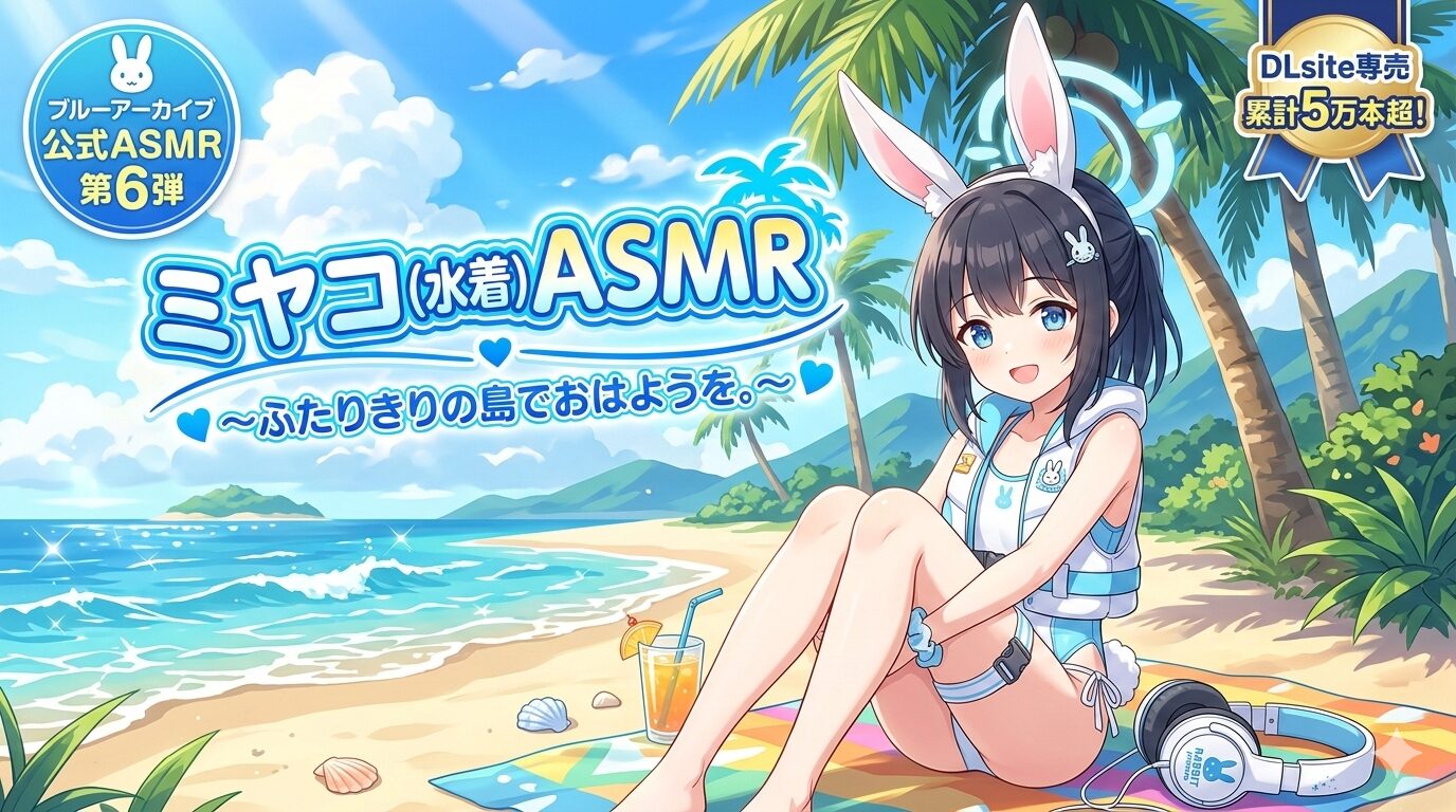 「ミヤコ(水着)ASMR~ふたりきりの島でおはようを。~」は、ブルーアーカイブ公式ASMRの第6弾として2024年7月22日に発売された音声作品です。DLsite専売で累計販売数5万7千本を超える大ヒットを記録しており、声優・藤田茜さんが演じる水着ミヤコとの無人島での濃密な一日を楽しめます。結論として、この作品はDLsiteでのみ購入・視聴が可能です。