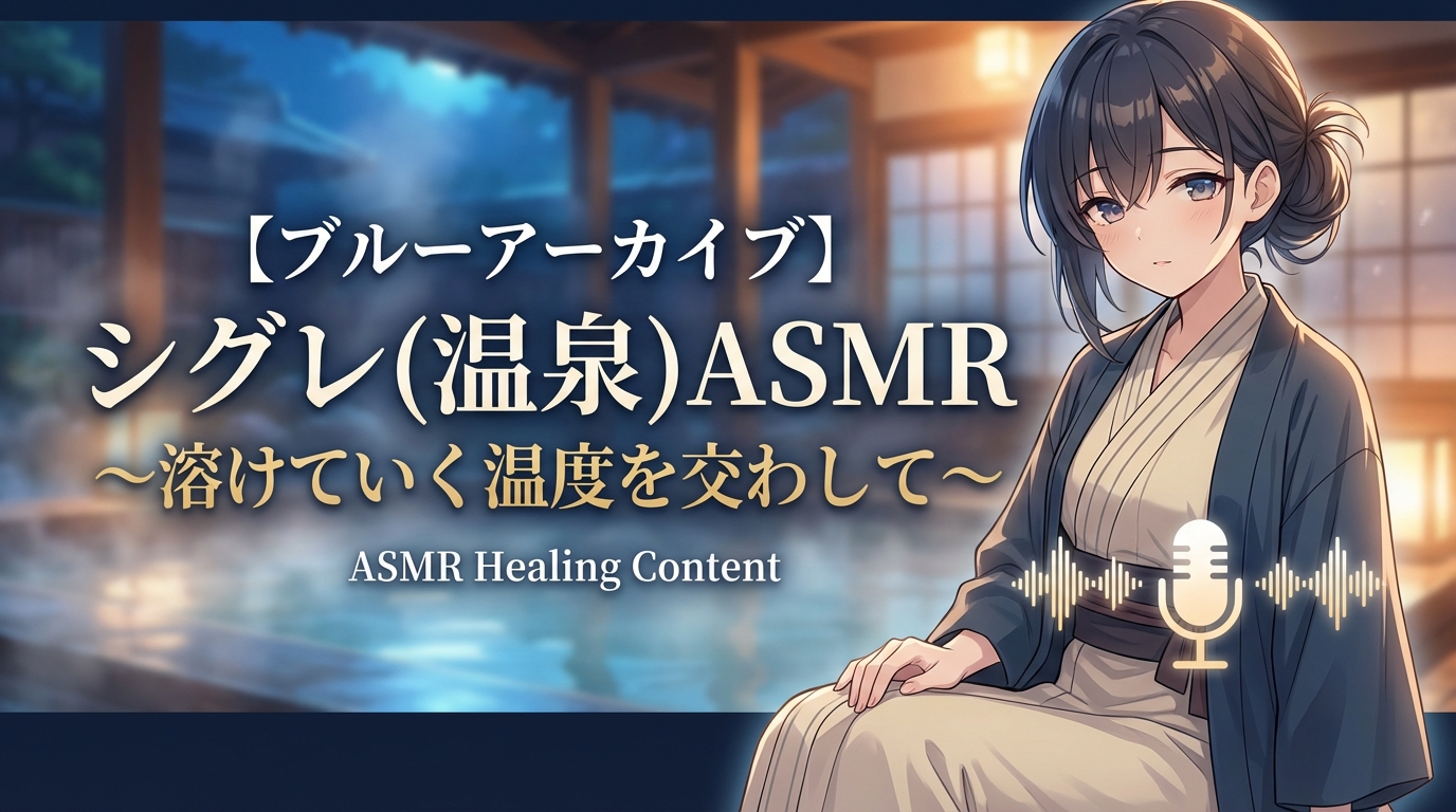 「【ブルーアーカイブ】シグレ(温泉)ASMR~溶けていく温度を交わして~」は、ブルアカ公式ASMRシリーズの中でも特に高い完成度を誇る作品です。河瀬茉希さんが演じるシグレの「ゲームでは聴けない声」、からかいと甘えが絶妙に交差する距離感、目隠しというASMRの特性を最大限に活かしたシチュエーション設計、そして雪山から温泉、布団の中まで一晩の旅行を追体験させる没入感の高い環境音——これらすべてが92分に凝縮された、シグレ推しの先生にとって間違いなく必聴の一作です。全年齢対象でASMR初心者でも入りやすく、販売数25,000本超という実績がその品質を証明しています。気になった方はぜひDLsiteでチェックしてみてください。