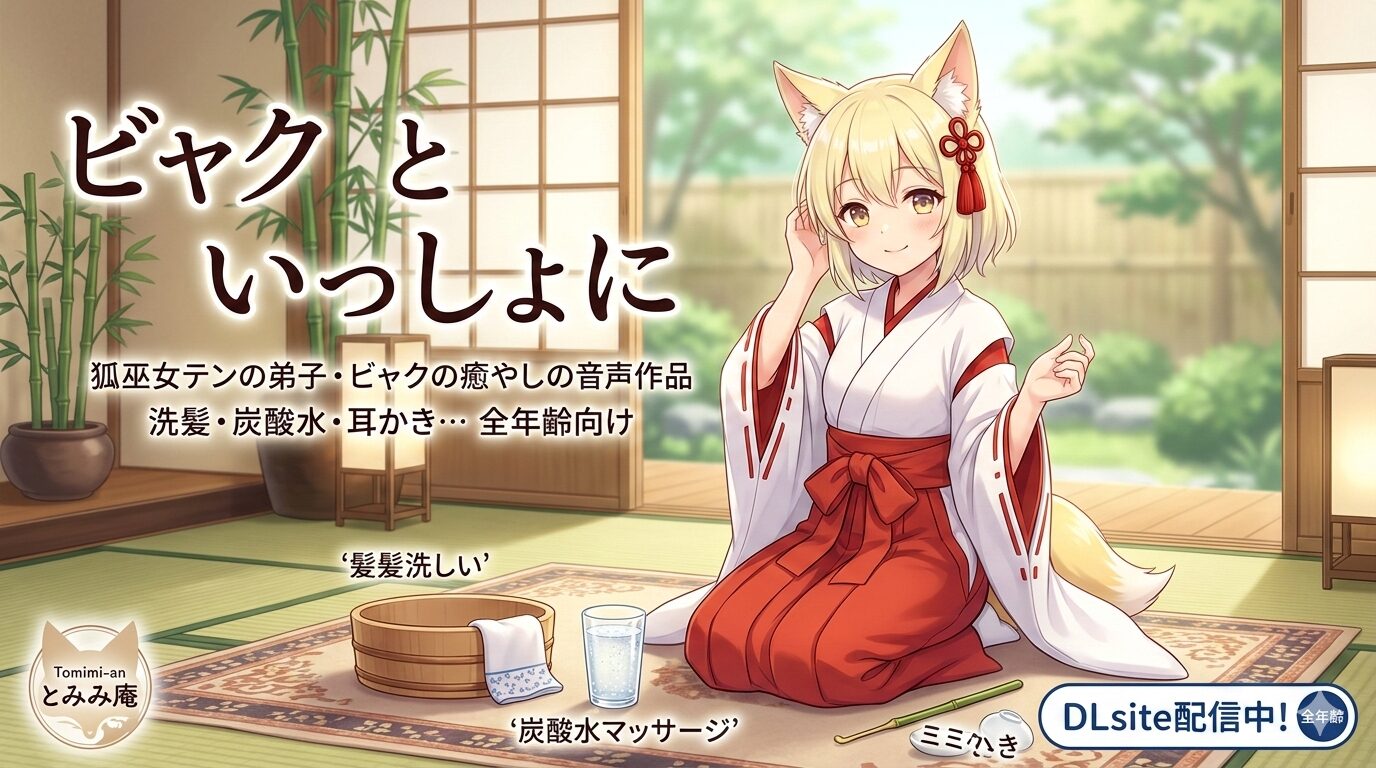 とみみ庵の人気シリーズ「狐巫女テンの耳かき」番外編として制作された「ビャクといっしょに」は、DLsiteで配信中の全年齢向け癒し系音声作品です。テンの弟子・ビャクが主役を務め、洗髪や炭酸水頭皮マッサージ、耳かきなど多彩な施術でリスナーを癒してくれる約2時間30分のボリュームたっぷりな一作。販売数14,000本以上を記録し、高い評価を獲得しています。