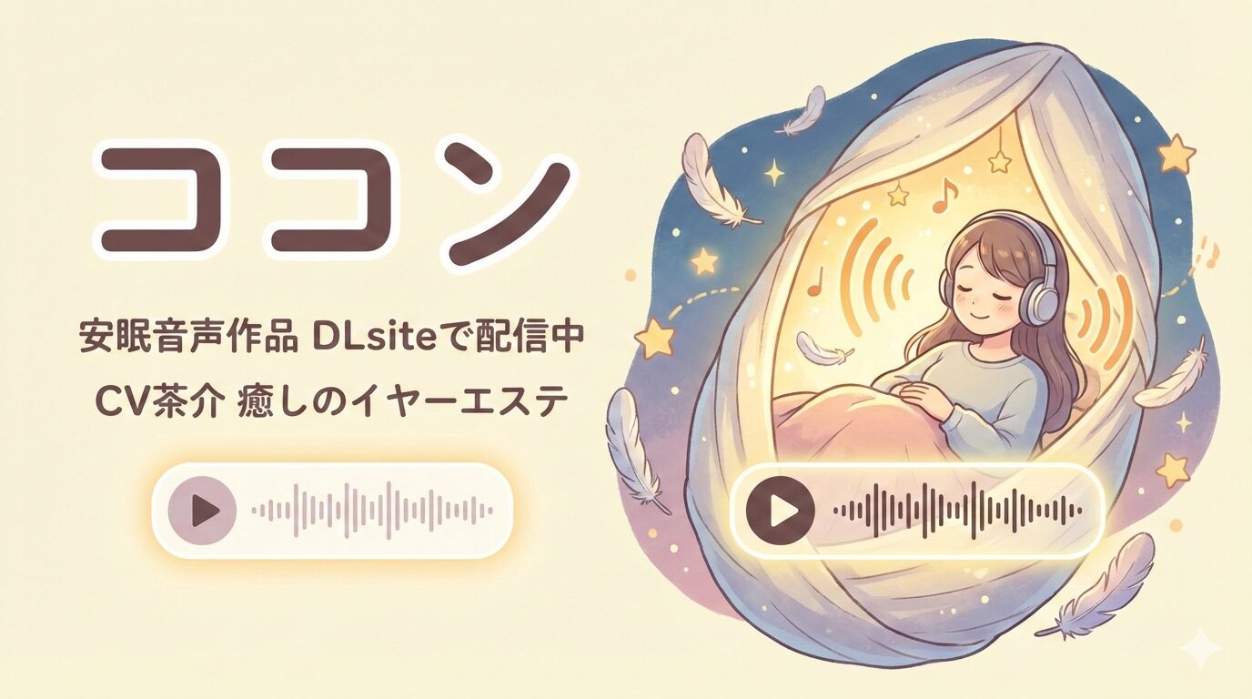 サークル・アラベスクが手がける女性向け安眠音声作品「ココン」は、DLsiteで配信中です。CV茶介さんが演じる優しい恋人・成瀬さんの「おうちイヤーエステ」で極上の癒し体験ができる本作は、レビュー2,300件超え・評価4.9という驚異的な支持を受けています。この記事では作品の内容・口コミ・購入方法を詳しくまとめました。