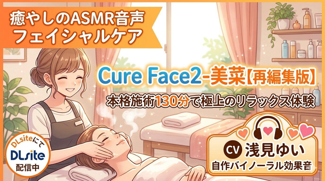 「Cure Face2-美菜【再編集版】」は、フェイシャルケア専門店という独自の舞台設定、浅見ゆいさんの魅力的な演じ分け、約130分にわたる本格的な施術体験、そしてバイノーラル自作効果音のリアルさが融合した、癒しASMR音声作品の傑作です。91件のレビューが示す高い評価と、多言語版の展開やグッズ化にまで至る根強い人気は、作品のクオリティを如実に物語っています。耳かき系ASMRでは得られない新しい癒しの形を探している方にこそ、ぜひ一度手に取っていただきたい一本です。