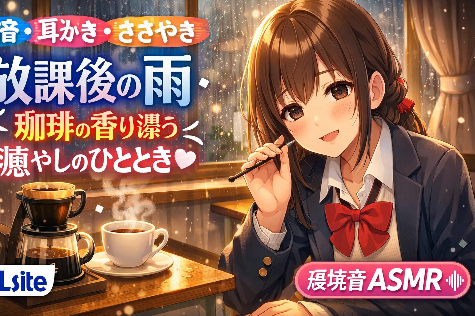 | 作品名 | 【雨音・耳かき・ささやき】放課後の雨、珈琲の香り漂う癒やしのひととき【環境音ASMR】 |