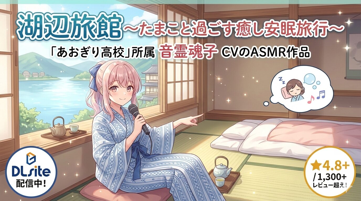 「湖辺旅館~たまこと過ごす癒し安眠旅行~」は、VTuberグループ「あおぎり高校」所属の音霊魂子さんがCVを務める全年齢向け癒しASMR作品です。DLsite評価4.8以上、レビュー1,300件超えの大人気タイトルで、現在DLsiteにて配信中です。この記事では配信状況や口コミ、作品の魅力を徹底解説します。
