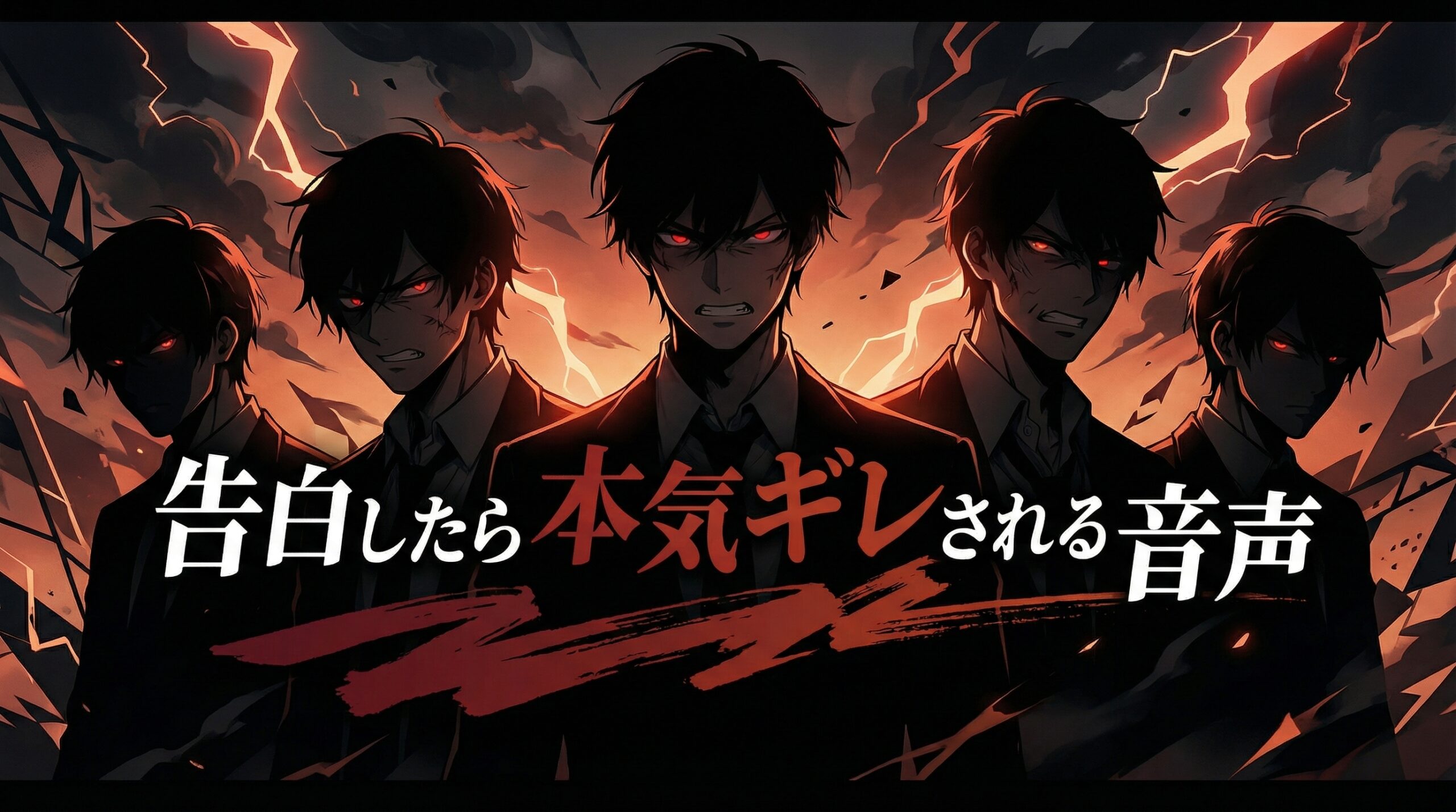 「告白したら本気ギレされる音声」は、リスナーが5人の男性キャラクターそれぞれに告白し、そのたびに全力で「本気ギレ」される——という、ありそうでなかったシチュエーションボイス作品です。甘い囁きでもなければ、ツンデレの照れ隠しでもありません。タイトルの通り、愛情ゼロ、容赦なし。嫌悪と拒絶と罵倒が全力でリスナーに叩きつけられます。