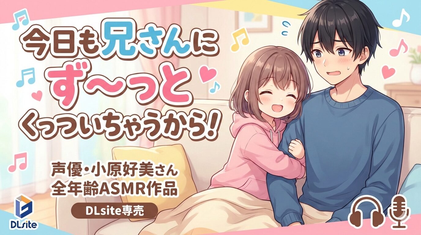 「今日も兄さんにず~っとくっついちゃうから!」は、人気声優・小原好美さんが甘えん坊な妹を演じる全年齢ASMR作品です。DLsite専売で配信中であり、購入・視聴できるのはDLsiteのみとなっています。この記事では、作品の概要・トラック構成・口コミ評判からおすすめポイントまで、購入前に知りたい情報をまとめました。