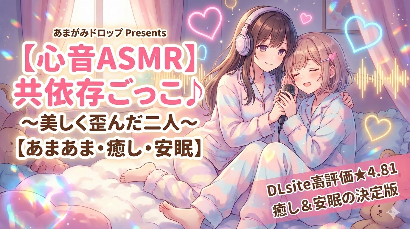「【心音ASMR】共依存ごっこ♪~美しく歪んだ二人~【あまあま・癒し・安眠】」は、サークル「あまがみドロップ」が制作した全年齢向け癒しASMR音声作品です。心音×共依存という独特のコンセプトで、DLsiteにて約4,900本を売り上げ、★4.81という圧倒的高評価を獲得しています。本記事では配信先や口コミ、見どころを詳しく解説します。