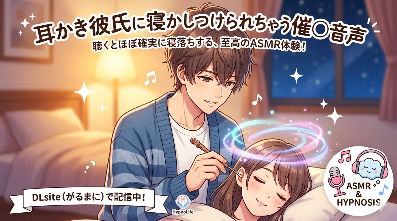 「耳かき彼氏に寝かしつけられちゃう催○音声」は、同人サークルHypnoLifeが制作した女性向け全年齢の催眠×耳かきASMR音声作品です。DLsiteで配信中であり、660円で購入・視聴できます。「聴くとほぼ確実に寝落ちする」と評判の名作を、本記事で徹底的にご紹介します。