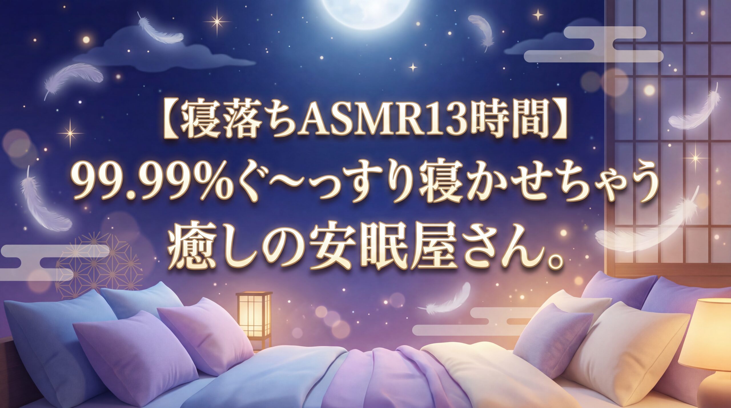 | 正式タイトル | 【寝落ちASMR13時間】99.99%ぐ~っすり寝かせちゃう癒しの安眠屋さん。(極上耳かき・マッサージ・赤ちゃん綿棒・囁き) |
