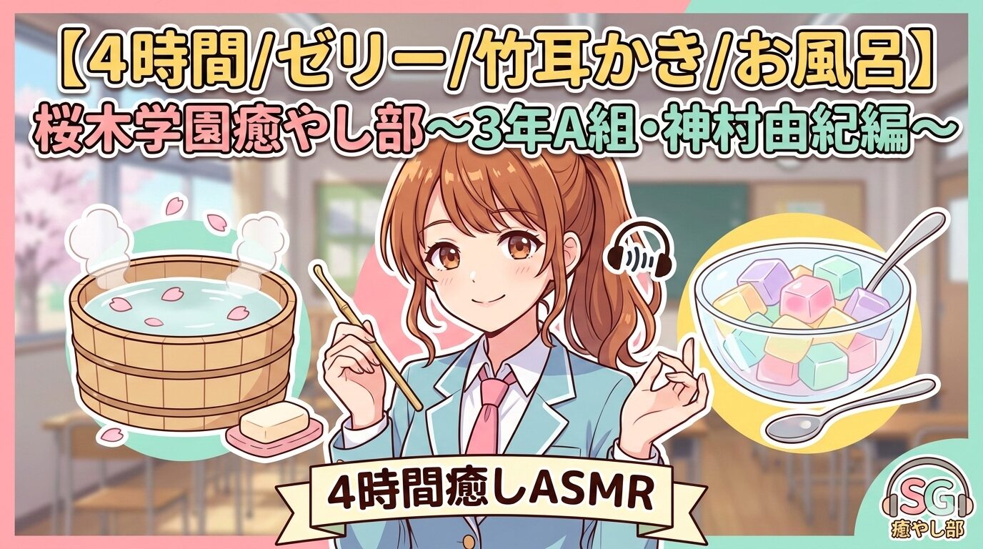 「桜木学園癒やし部~3年A組・神村由紀編」は、声優・青木瑠璃子さんによる甘やかしお姉さんボイスと、ゼリーマッサージという独自のASMR体験が組み合わさった、他にはない魅力を持つ癒し音声作品です。最高品質のバイノーラルマイクで収録された立体的な音響、竹耳かきやお風呂シーンなどバリエーション豊かなシチュエーション、そして安眠トラックまで備えた約4時間の大ボリュームは、日々の疲れを癒してくれる頼もしい一作と言えます。