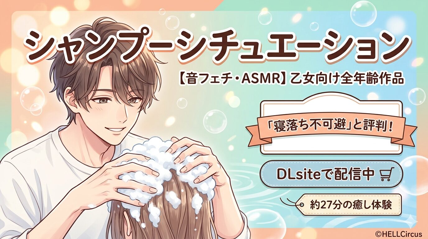 「シャンプーシチュエーション」は、サークルHELLCircusが制作した乙女向け全年齢ASMR音声作品です。DLsiteで配信中で、指の綺麗なお兄さんが丁寧にシャンプーしてくれる約27分の癒し体験を楽しめます。「寝落ち不可避」と評判の本作について、配信情報・収録内容・口コミを詳しくまとめました。