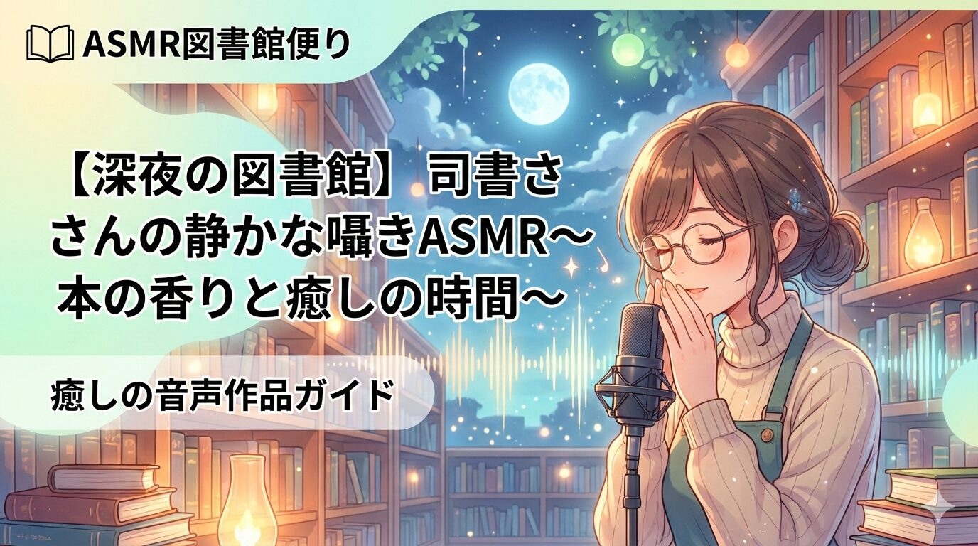 「【深夜の図書館】司書さんの静かな囁きASMR~本の香りと癒しの時間~」は、深夜の静かな図書館を舞台に、司書が囁き声で語りかけてくれる癒し系ASMRコンセプトです。2026年2月25日現在、DLsiteをはじめとする主要配信サイトでは同名作品の取り扱いが確認できていませんが、同じ「図書館×司書×囁き」というテーマを持つ高品質な音声作品がDLsiteに複数存在しています。本記事では、このジャンルの魅力と実際に聴ける類似作品を詳しくご紹介します。