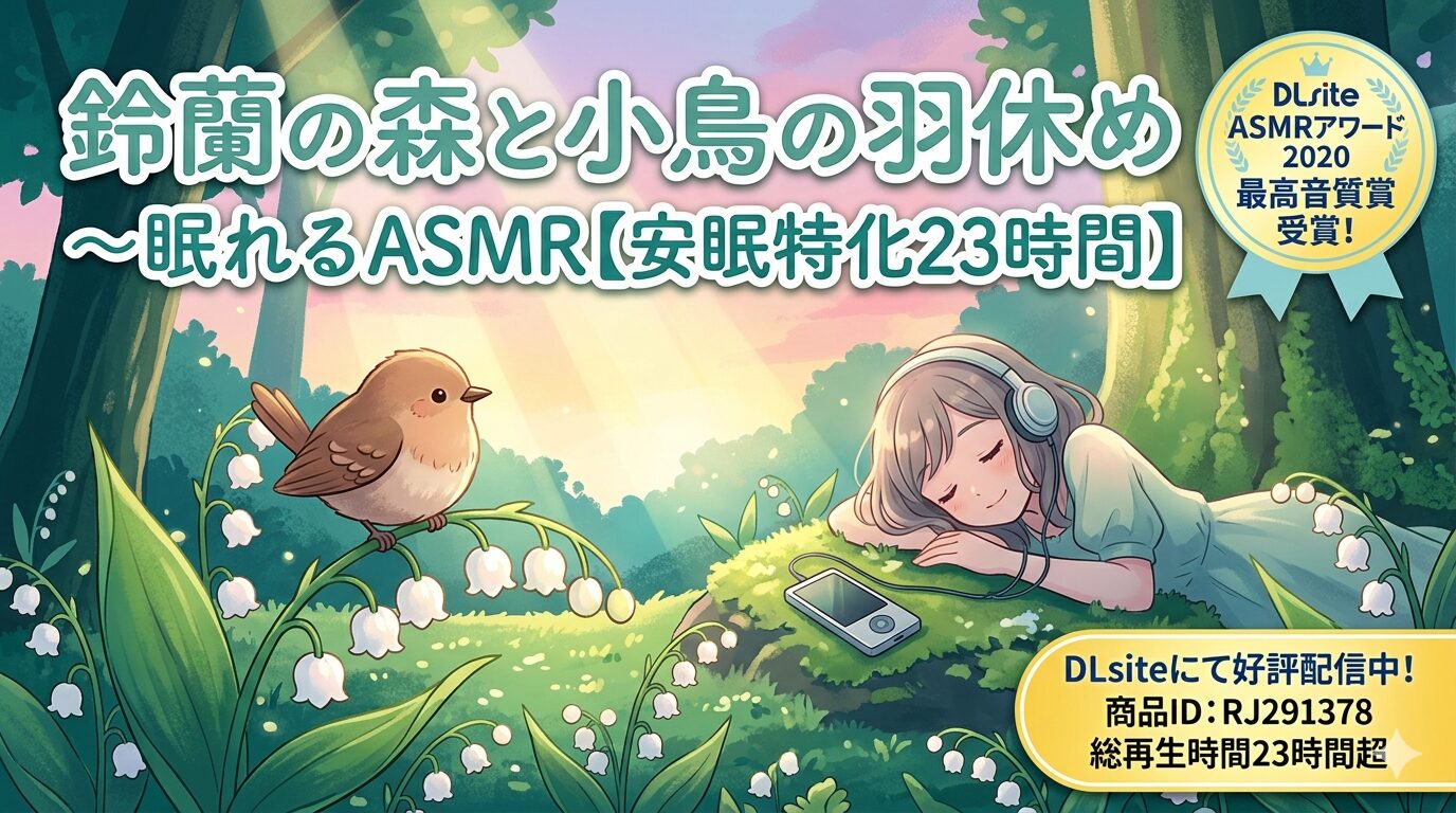 「鈴蘭の森と小鳥の羽休め~眠れるASMR【安眠特化23時間】」は、DLsiteで配信中の全年齢向け安眠特化ASMRです。サークル「シロクマの嫁」が制作し、声優・伊ヶ崎綾香が脚本から音響・編集まで一人で手がけた本作は、総再生時間23時間超という圧倒的ボリュームと高品質な音作りで、2020年DLsite ASMRアワード《最高音質賞》を受賞しています。