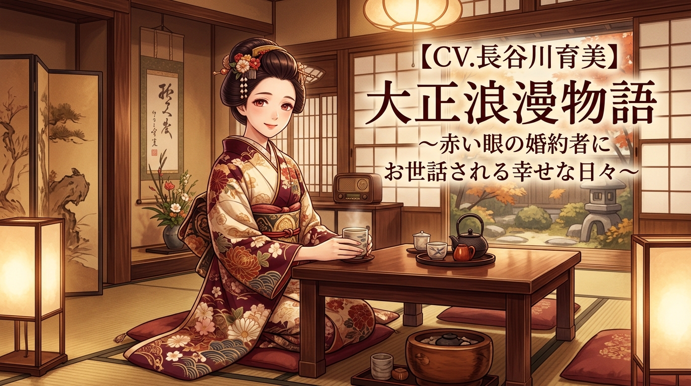 「【CV.長谷川育美】大正浪漫物語~赤い眼の婚約者にお世話される幸せな日々~」は、大正時代を舞台にしたシナリオ重視の癒し系音声作品です。長谷川育美さんの繊細な演技と、魚をさばく音や耳かきなど録り下ろしのこだわり音響が高い評価を得ており、DLsiteで配信中です。