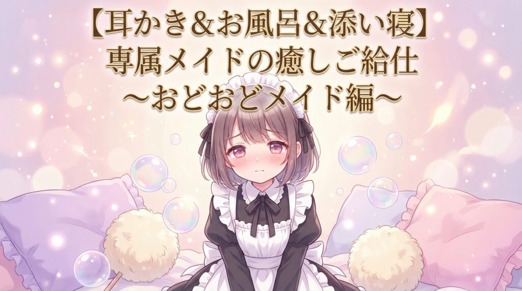 「【耳かき&お風呂&添い寝】専属メイドの癒しご給仕 〜おどおどメイド編〜」は、DLsiteで独占配信中の全年齢向けバイノーラルASMR作品です。CV後藤彩佐が演じる"おどおどメイド"の癒しご給仕を、約96分のたっぷりボリュームで堪能できます。本記事... -