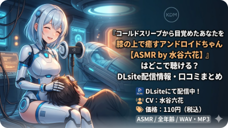 「コールドスリープから目覚めたあなたを膝の上で癒すアンドロイドちゃん【ASMR by 水谷六花】」は、サークルKDMが制作し、声優・水谷六花さんが演じるアンドロイド「コユキ」による癒しのASMR作品です。DLsiteで配信中であり、139年の眠りから目覚めた孤... -
