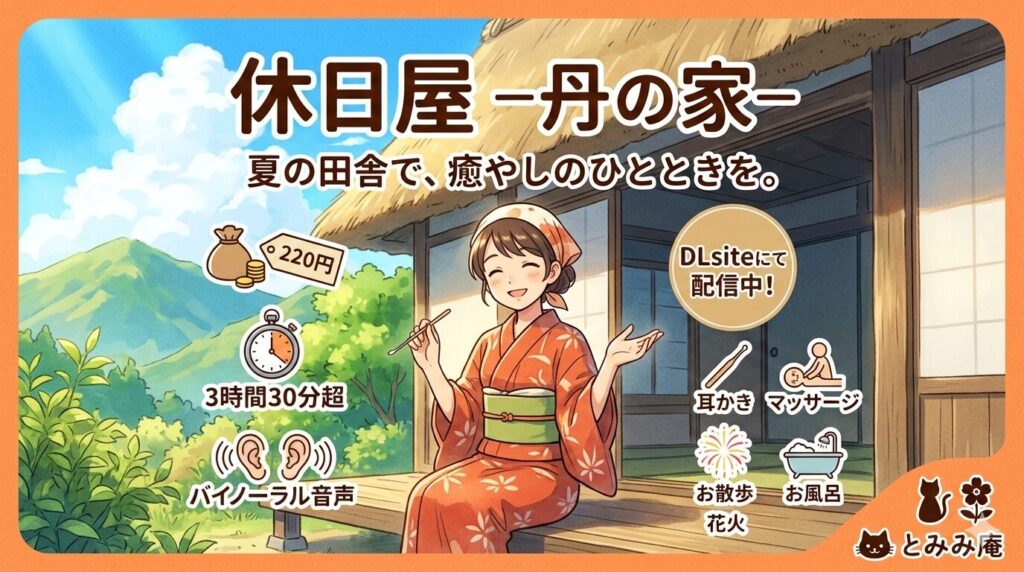 「休日屋 ━丹の家━」はどこで聴ける?DLsite配信情報・トラック詳細・口コミまとめ 「休日屋 ━丹の家━」は、サークル・とみみ庵が制作した全年齢向けバイノーラル音声作品で、DLsiteにて220円で配信中です。夏の田舎を舞台に、耳かき・マッサージ・お散歩... -