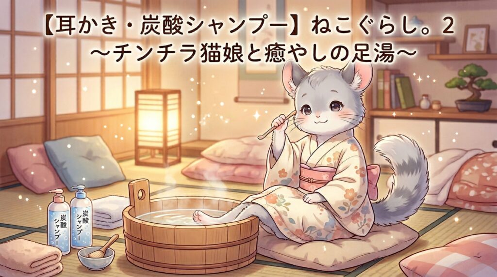 「【耳かき・炭酸シャンプー】ねこぐらし。2~チンチラ猫娘と癒やしの足湯~」は、人気声優・伊藤かな恵さんが演じるチンチラ猫娘の癒しASMR音声作品です。DLsiteで配信中で、2時間超の大ボリュームに耳かき・炭酸シャンプー・足湯など多彩なASMR音が収録... -