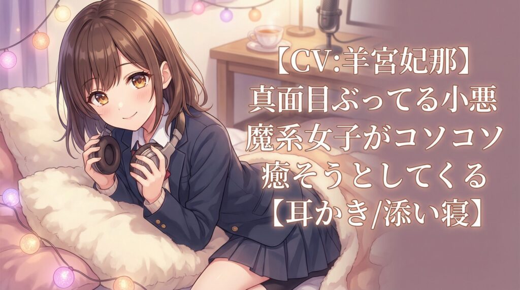 『【CV:羊宮妃那】真面目ぶってる小悪魔系女子がコソコソ癒そうとしてくる【耳かき/添い寝】』は、DLsiteで配信中のASMR音声作品です。人気声優・羊宮妃那さんが小悪魔系女子「東雲涼香」を演じ、学園を舞台に耳かきや添い寝で"コソコソ"癒してくれる全7ト...
