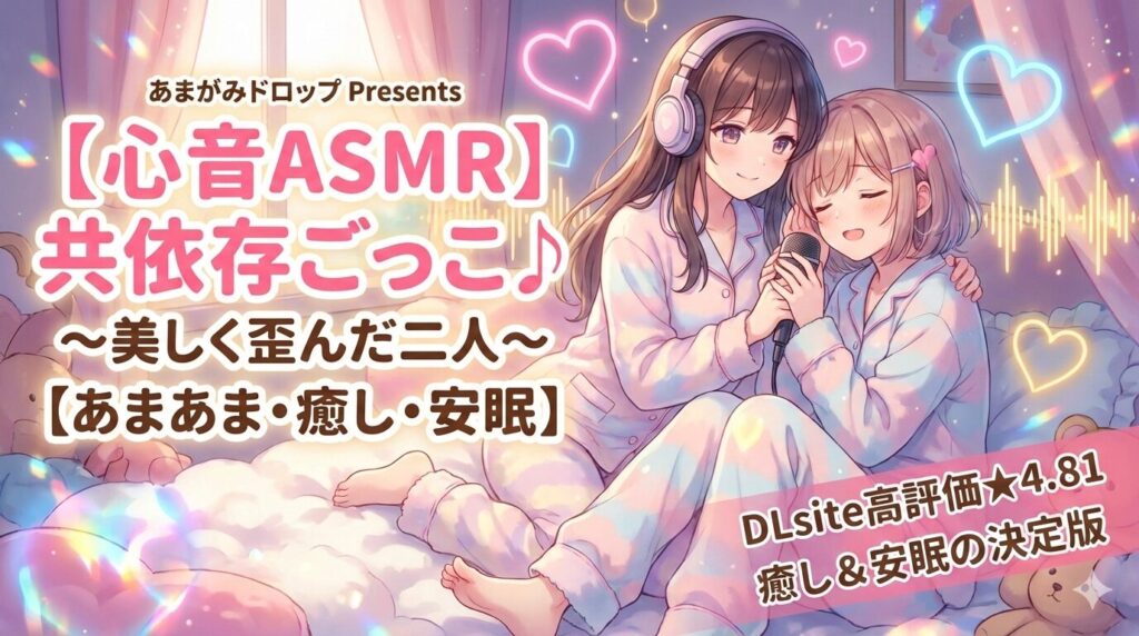 「【心音ASMR】共依存ごっこ♪~美しく歪んだ二人~【あまあま・癒し・安眠】」は、サークル「あまがみドロップ」が制作した全年齢向け癒しASMR音声作品です。心音×共依存という独特のコンセプトで、DLsiteにて約4,900本を売り上げ、★4.81という圧倒的高評... -