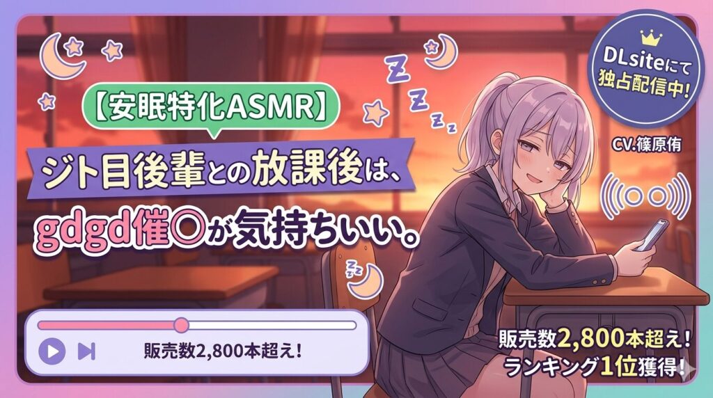 「【安眠特化ASMR】ジト目後輩との放課後は、gdgd催○が気持ちいい。」は、人気サークル「だらだらボイス」が手がける安眠特化ボイスシリーズ第3弾として、DLsiteで配信中の全年齢バイノーラルASMR作品です。CV篠原侑さんが演じるジト目ダウナー後輩・栗山... -