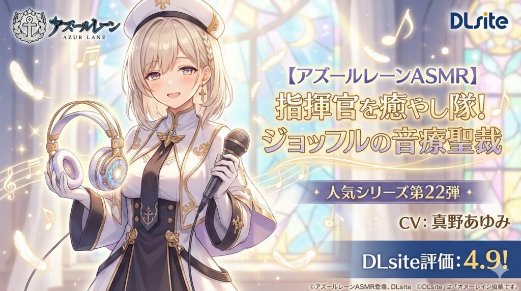 「【アズールレーンASMR】指揮官を癒やし隊!ジョッフルの音療聖裁」は、人気シリーズ第22弾として2025年11月に登場した全年齢ASMR作品です。CV真野あゆみが演じるジョッフルの厳格ながら温かい癒しが話題を呼び、DLsite評価は驚異の4.9点を記録しています... -